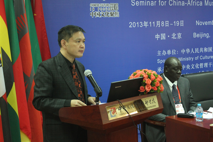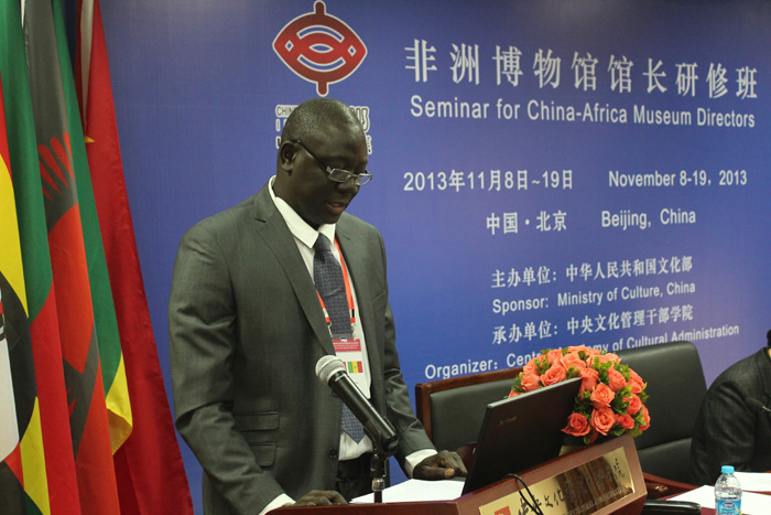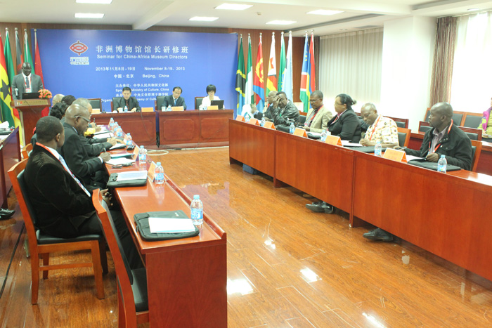 为深化中国与非洲国家文化交流与合作,2013年11月7日至20日,由文化部主办、中央文化管理干部学院承办的“中非博物馆馆长论坛暨非洲博物馆馆长研修班”在京举办。在11月8日举行的研修班开幕式上,文化部外联局非洲处处长松雁群、中央文化管理干部学院副院长段周武、塞内加尔非洲艺术博物馆馆长西奥先生致辞,来自埃塞俄比亚、津巴布韦等15个非洲国家的博物馆馆长共同表达了加强中非博物馆界交流的愿望。