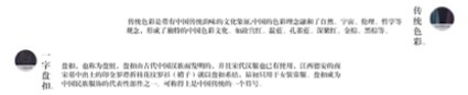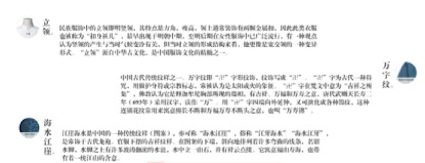 “中”代表的是中国的传统和文明。款式上,融合中国历代经典款式。如立领对襟,明代就已出现,盛行于清;开襟,商代就已出现,盛行于唐宋;连肩袖,是中国最古老的服装结构。面料上,采用传统真丝面料。如宋锦,始于宋代,属世界级非物质文化遗产;漳缎,始于明末清初,属省级非物质文化遗产。纹样上,展示传统纹样的精华。如海水江崖纹,宋代已出现在服装上;万字纹,汉代已应用于服饰上。工艺上,采用中国特色传统工艺。如宋代就已使用的盘扣,盛行于清代的镶滚等。色彩上,选用了故宫红、靛蓝、孔雀蓝、深紫红、金棕、黑棕等厚重大方的传统色调。