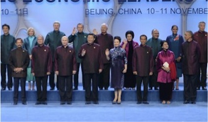2014年11月10日,国家主席习近平和夫人彭丽媛在北京为出席亚太经合组织(APEC)第二十二次领导人非正式会议的各成员经济体领导人、代表及配偶举行欢迎晚宴,为本次会议设计制作的特色中式服装亮相。